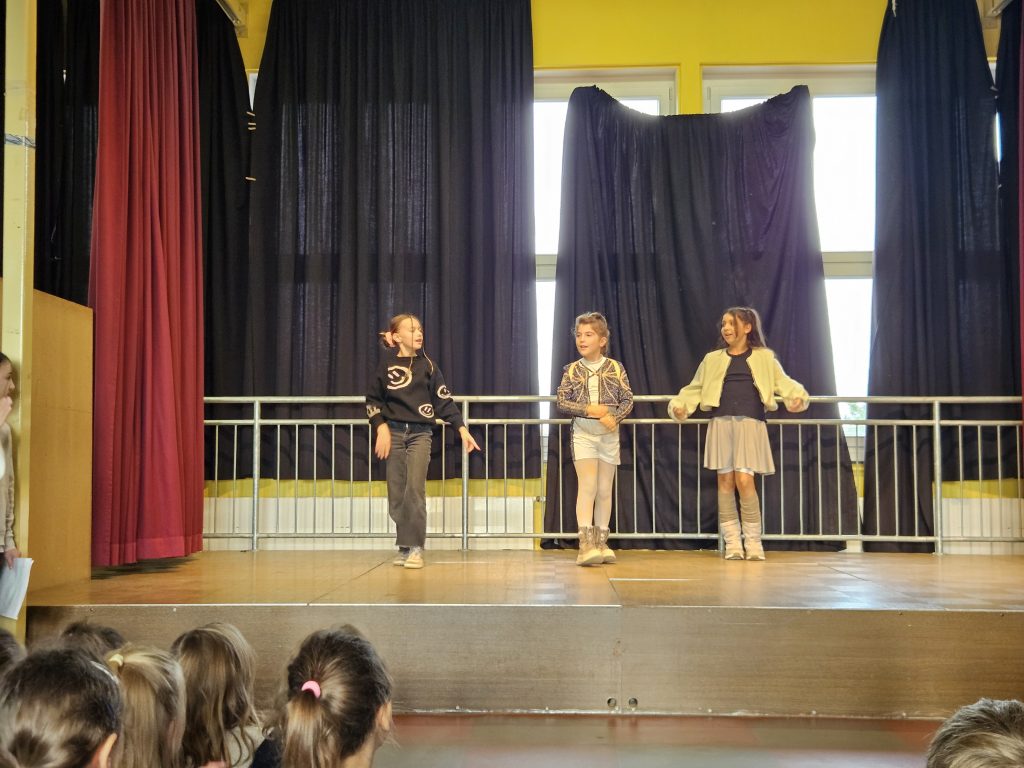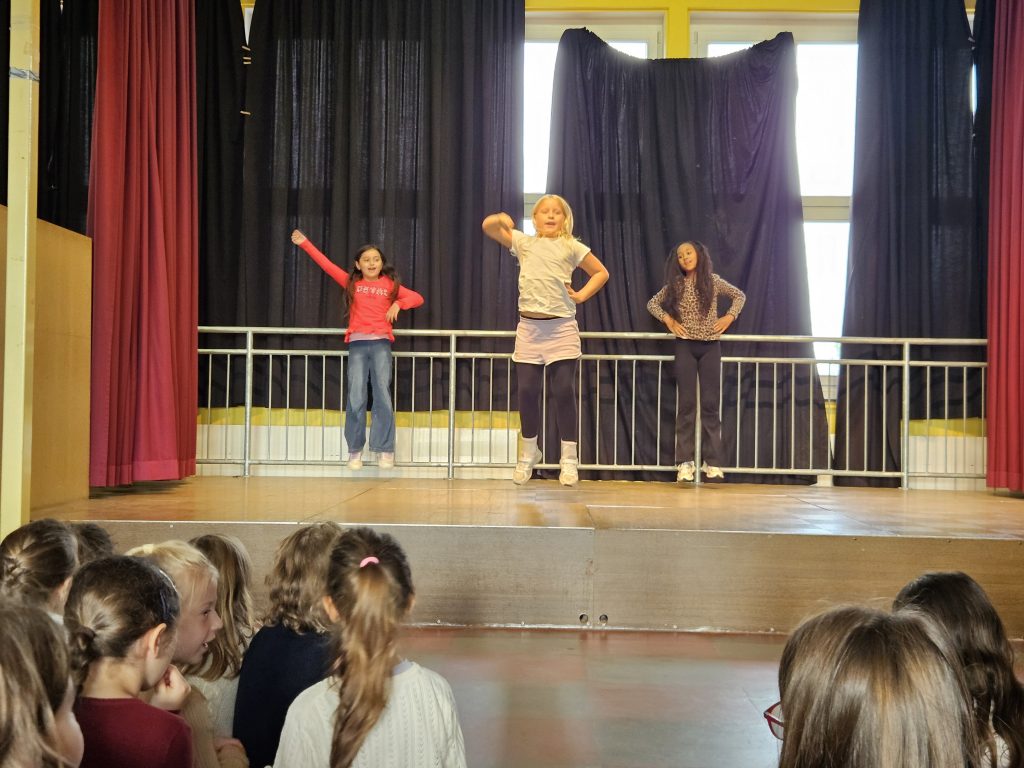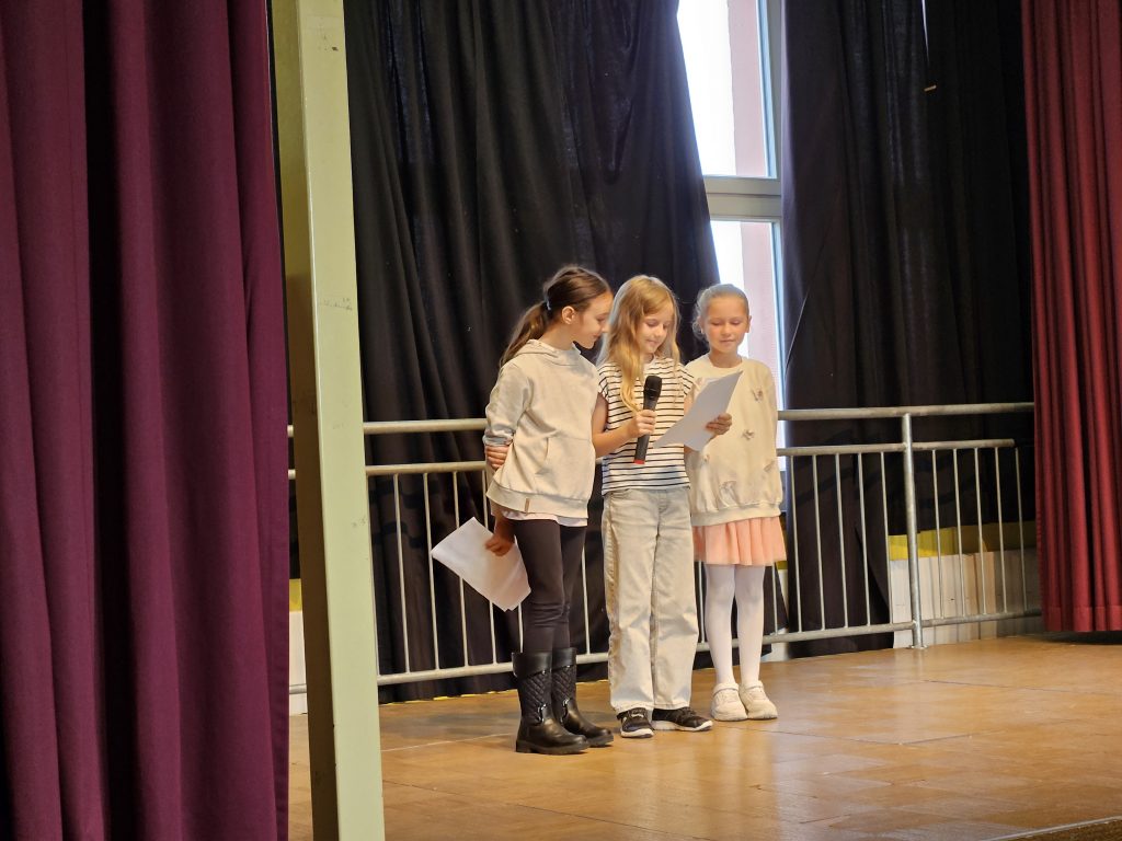 Am letzten Schultag vor den Ferien hieß es wieder: Willkommen zur bunten Stunde! Unsere drei Kinder-Moderatorinnen führten die OPS durch das vielfältige Programm in der Aula. Es gab dieses Mal viele Tänze, die präsentiert wurden, aber auch eine Sängerin, Witzeerzähler und eine Geigenspielerin trauten sich auf die Bühne. Dort wurden sie mit großem Applaus belohnt!