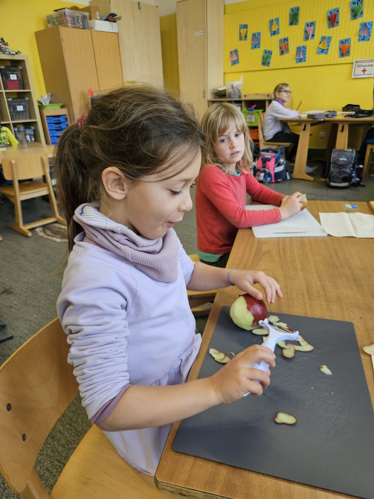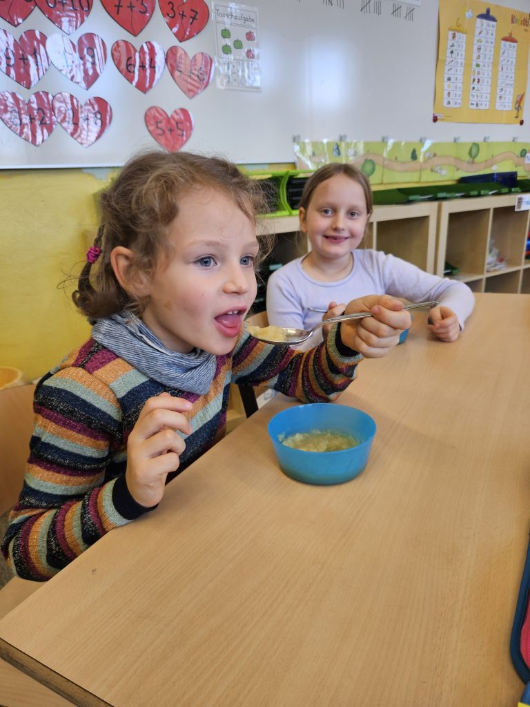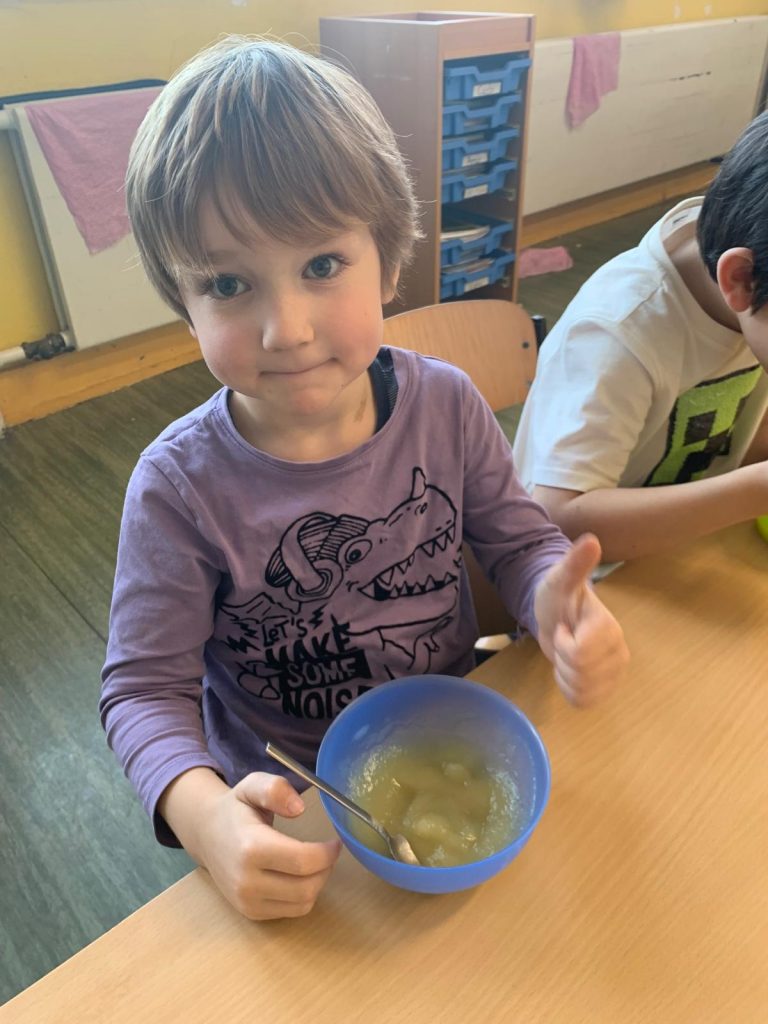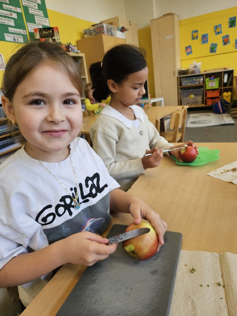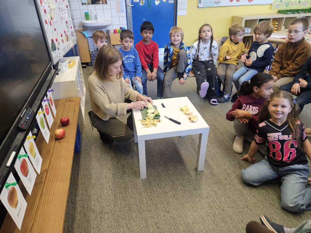 In den letzten Wochen haben wir im Sachunterricht den Apfel erforscht. Zuerst haben wir uns das Apfeljahr angeschaut, wie und wann er wächst und wie ein Apfel aufgebaut ist. Dann haben wir den Apfel mit allen Sinnen entdeckt. Natürlich gab es da auch Kostproben von verschiedenen Apfelsorten. Manche waren hart und sauer, andere weich und sehr süß. Nachher wusste jeder von uns, welchen Apfel er besonders gerne mag. Zum Abschluss gab es lecker Apfelmus, welches wir natürlich selbst gemacht haben: Äpfel schälen, schneiden und im großen Kochtopf zu Mus verarbeiten. Mhh, das war lecker!