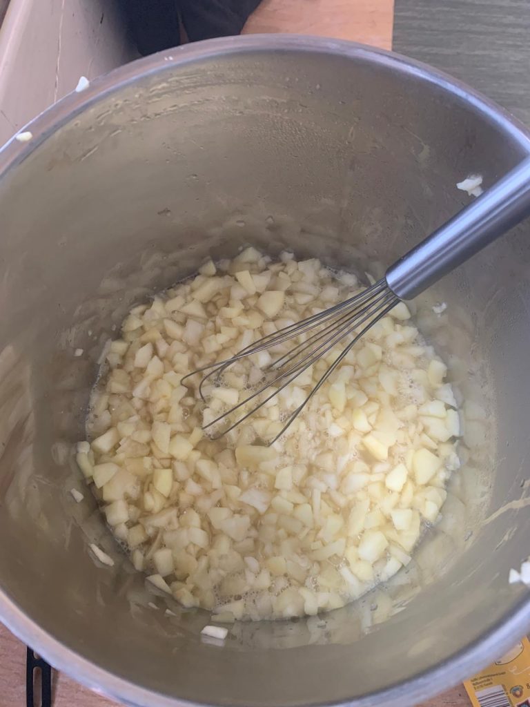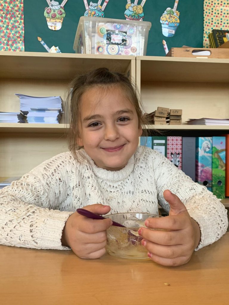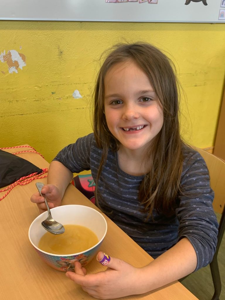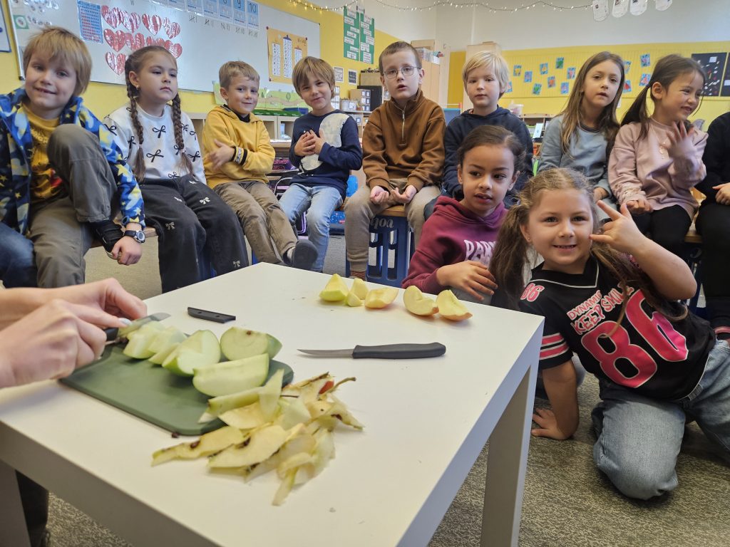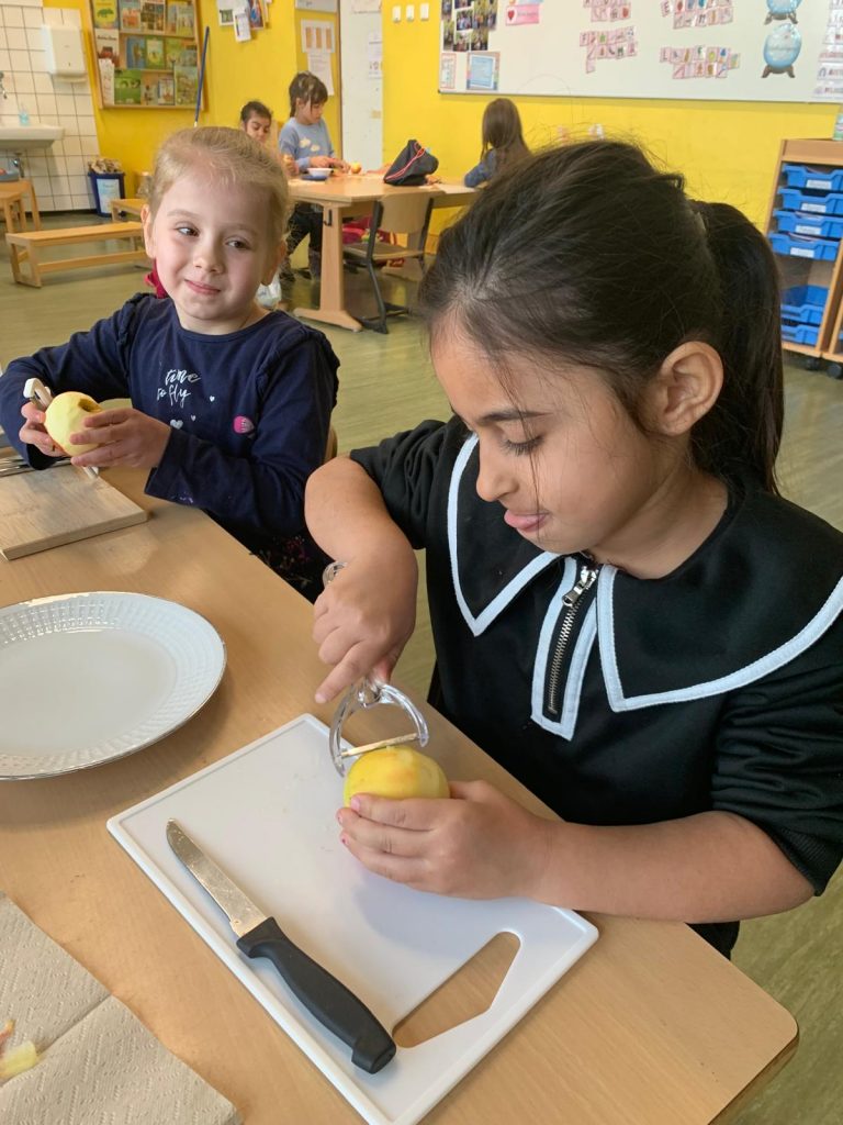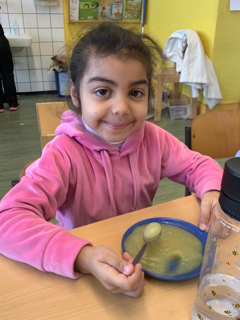 In den letzten Wochen haben wir im Sachunterricht den Apfel erforscht. Zuerst haben wir uns das Apfeljahr angeschaut, wie und wann er wächst und wie ein Apfel aufgebaut ist. Dann haben wir den Apfel mit allen Sinnen entdeckt. Natürlich gab es da auch Kostproben von verschiedenen Apfelsorten. Manche waren hart und sauer, andere weich und sehr süß. Nachher wusste jeder von uns, welchen Apfel er besonders gerne mag. Zum Abschluss gab es lecker Apfelmus, welches wir natürlich selbst gemacht haben: Äpfel schälen, schneiden und im großen Kochtopf zu Mus verarbeiten. Mhh, das war lecker!