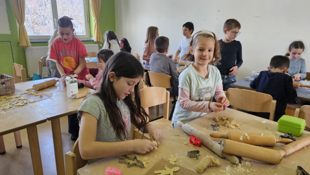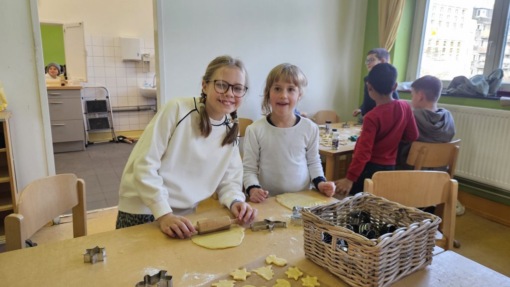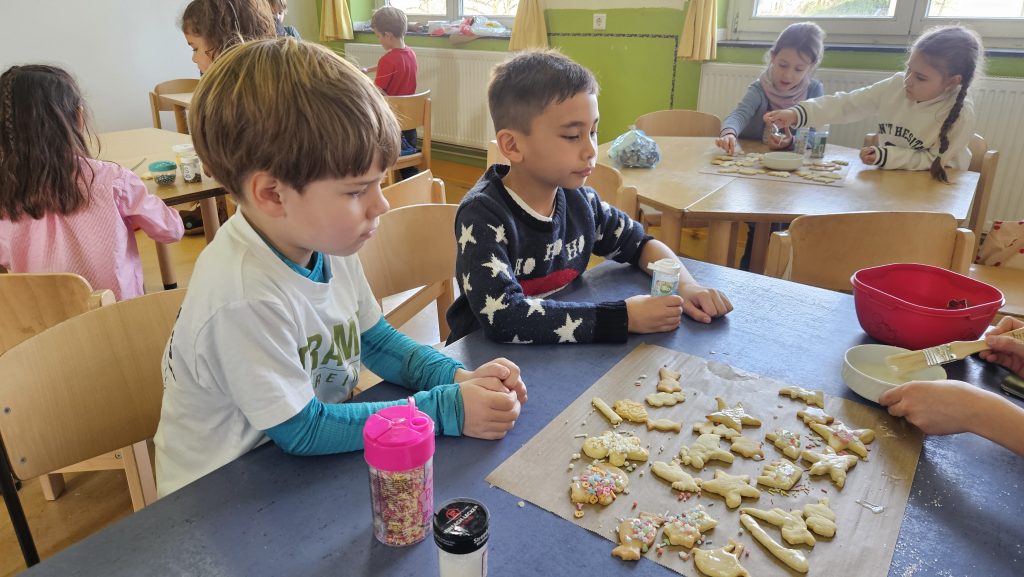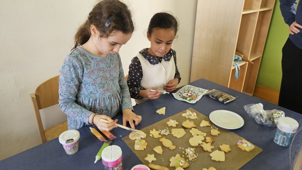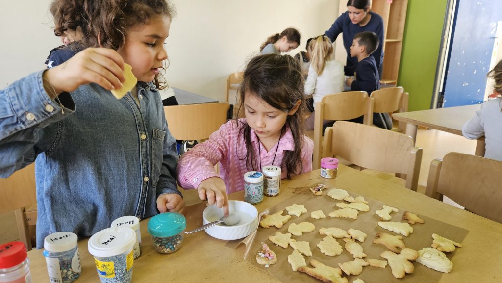 Am Dienstag und Mittwoch duftete es in der OPS ganz wunderbar nach Weihnachten. Ein Plätzchenduft hing in der Luft. Die Marienkäfer und Hummeln haben zusammen mit ihren Paten, den Kraken und Krebsen Plätzchen gebacken. Dabei wurde der Teig ausgerollt, ausgestochen, auf ein Backblech zum Backen gelegt und anschließend mit viel Zuckerguss und Streuseln dekoriert. Natürlich wurde in der Weihnachtsbäckerei ab und zu auch genascht. Trotzdem hatten wir am Ende viele leckere Plätzchen, die wir uns in den nächsten Tagen im Unterricht schmecken lassen können. Neben der ganzen Arbeit des Ausstechens und Verzierens, wollen wir auch noch einmal Danke sagen an die Eltern, die sich um die Vorbereitung des Teigs gekümmert haben!