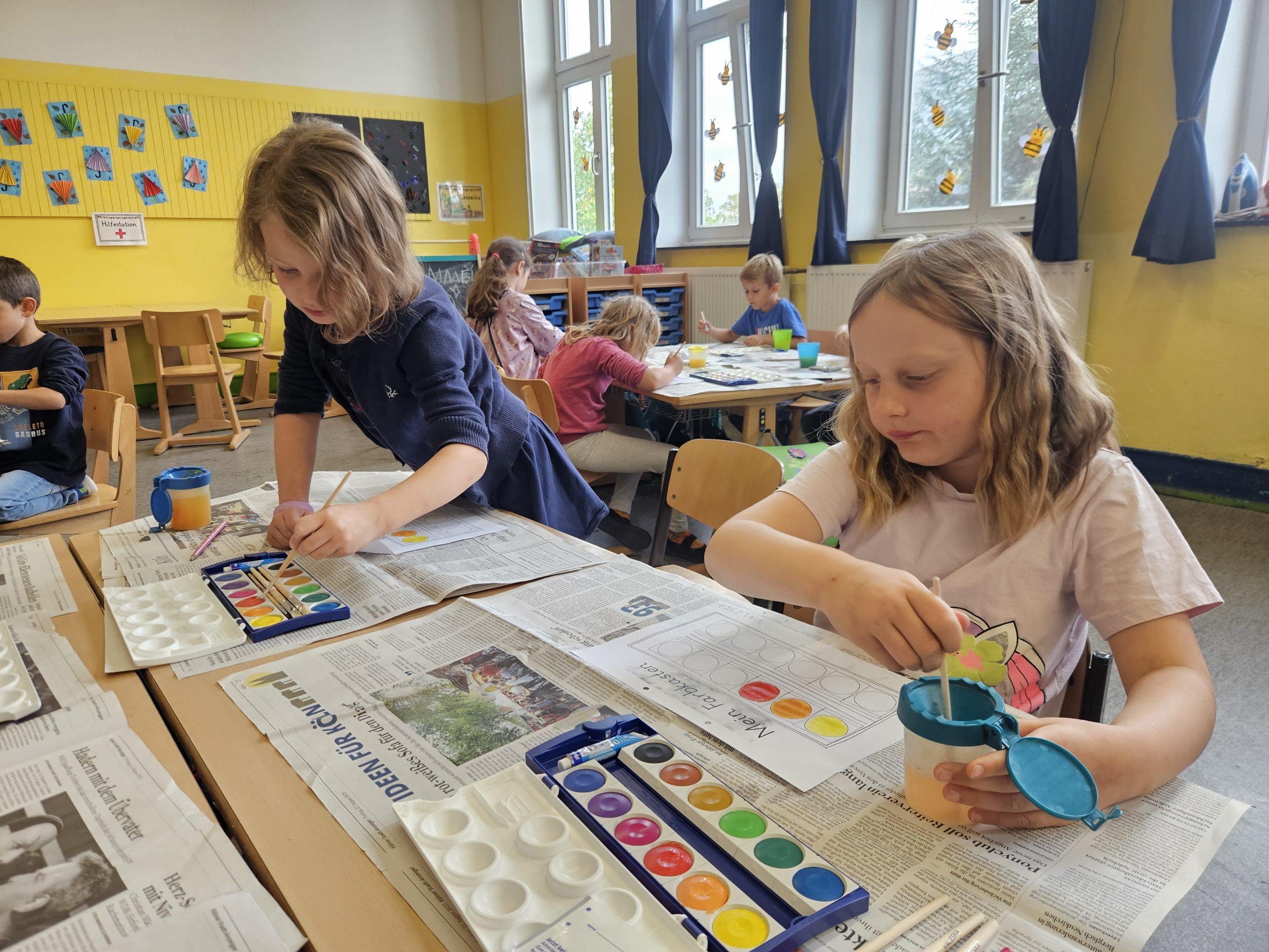 Heute haben wir im Kunstunterricht zum ersten Mal mit unserem Farbkasten gearbeitet.