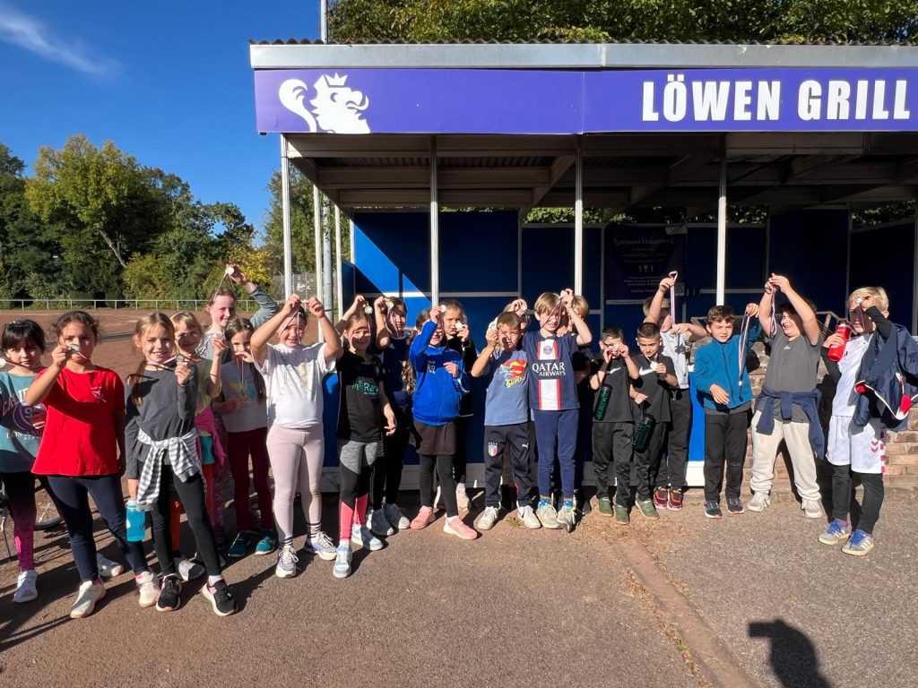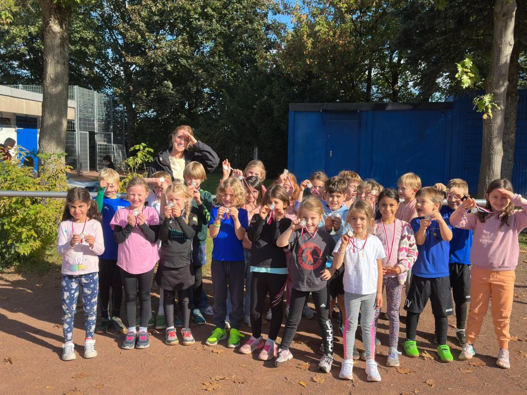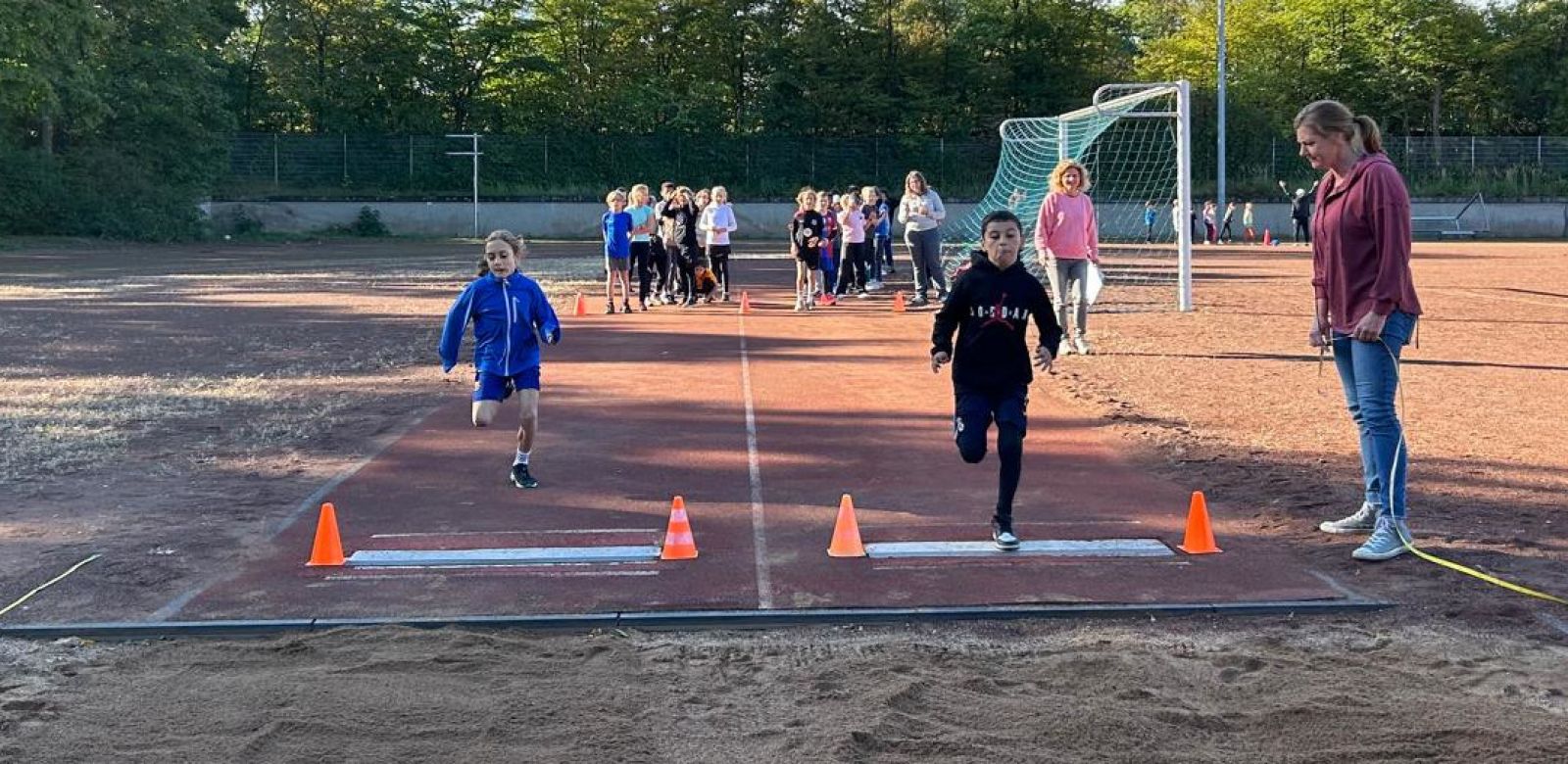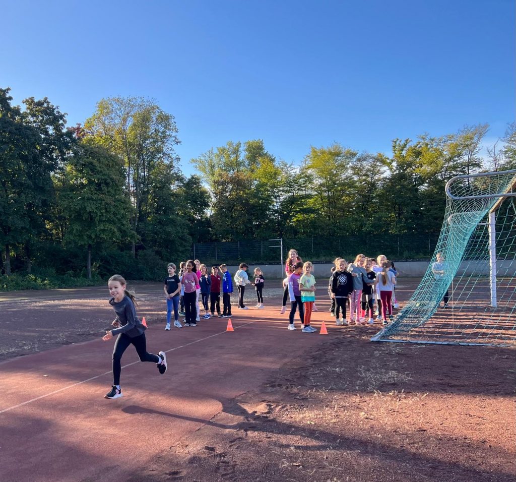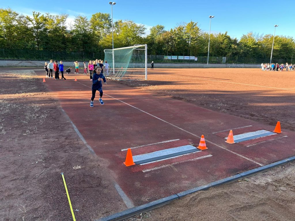 Nachdem unser Sportfest Ende des letzten Schuljahres abgesagt werden musste, konnten wir es heute bei schönem Herbstwetter nachholen. Bei kühlen Temperaturen, aber strahlendem Sonnenschein ging es morgens für die Klassen 2, 3 und 4 auf den Sportplatz des DJK Löwe. Dort mussten wir in drei Disziplinen antreten: Weitsprung, Sprint und Weitwurf. Natürlich feuerten wir uns gegenseitig an. Zur Belohnung gab es am Ende Medaillen und ein Eis für jeden. Das war super!